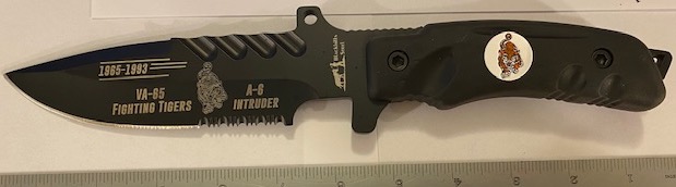 This is the VA-65 TIGERS “BOOT-KNIFE” now available in VERY limited quantities!!! It has the squadron logo and info on the blade, comes with a metal “cloisonne” built into the handle, and has the black sheath and strap. Get them while they last!