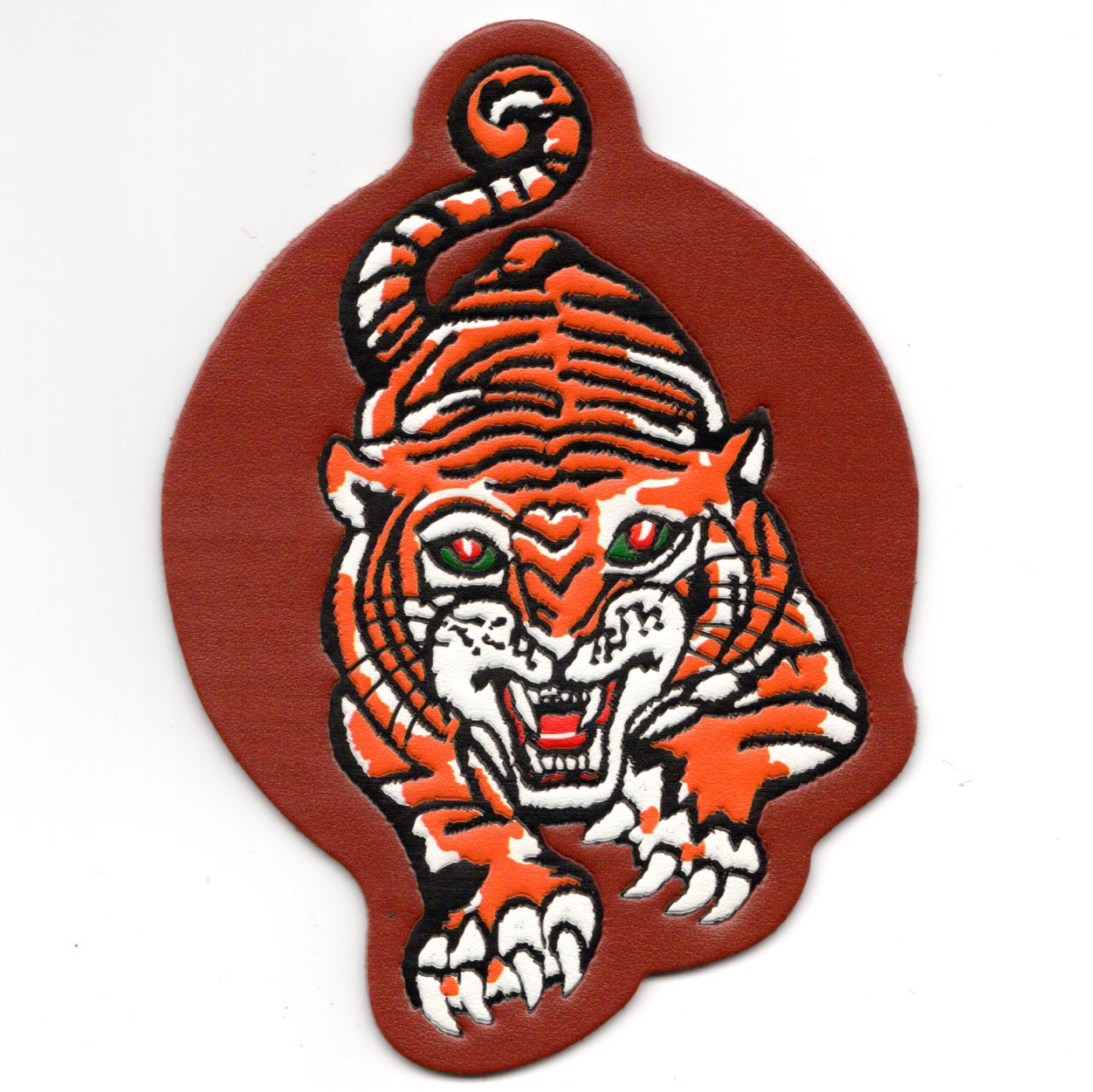 This is the 5-inch version of the mascot patch for the VA-65 ‘Tigers’. They were decommissioned in the early ’90s. They have SO much history, it would be difficult to put in this small section…..very storied Attack Squadron! Was asked to remake this version identical to the Vietnam-era version of their patch which was partially embroidered (twill background), yellow twill background, and orange border. This is a reproduction patch from that era and does NOT come with velcro already attached.