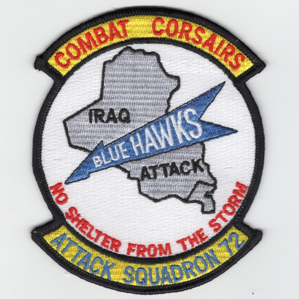 Attack Squadron 72 (VA-72) was an aviation unit of the U.S. Navy. It was established as Bomber Fighter Squadron 18 (VBF-18) on 25 January 1945. The squadron was redesignated as Fighter Squadron 8A (VF-8A) on 15 November 1946, as VF-72 on 28 July 1948, and finally as VA-72 on 3 January 1956. It was disestablished on 30 June 1991. The squadron’s nickname from 1945 to 1950 was “Bearcats”, followed by “Hawks” until 1962, and the Blue Hawks from that point forward. Its first insignia, a bearcat, was approved in 1946; a new one, featuring a peregrine falcon, was approved in 1950. Its last insignia, with a blue hawk, was current from 1956 until the squadron’s disestablishment 35 years later. This is the patch created for the “BLUE HAWKS” for their participation in Op DESERT STORM, says “Combat Corsairs” (top), and does not come with velcro attached. Found these in an “online auction”, so the numbers are limited.