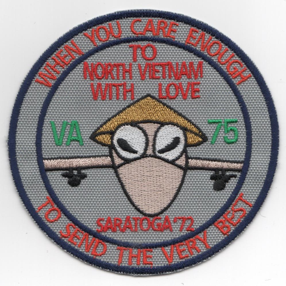 This is a reproduction of the 1972 cruise patch for the VA-75 Sunday Punchers onboard the USS Saratoga to North Vietnam. It says “WHEN YOU CARE ENOUGH” (top), TO NORTH VIETNAM WITH LOVE” (middle), and “TO SEND THE VERY BEST” (bottom). It also shows the aircraft wearing the “rice hat” common to the Vietnamese people. This patch does not have velcro.