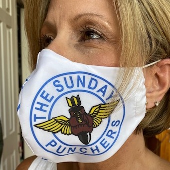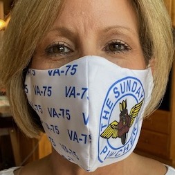 (Another AV8RSTUFF Creation): This is the white, cotton (I think) face mask (worn by Mechelle) with the squadron lettering on the right cheek, the squadron logo on the left cheek, and elastic straps for comfortable wear over the ears. This is NOT for use for medical personnel (yes, believe it or not I HAVE to say that!!)