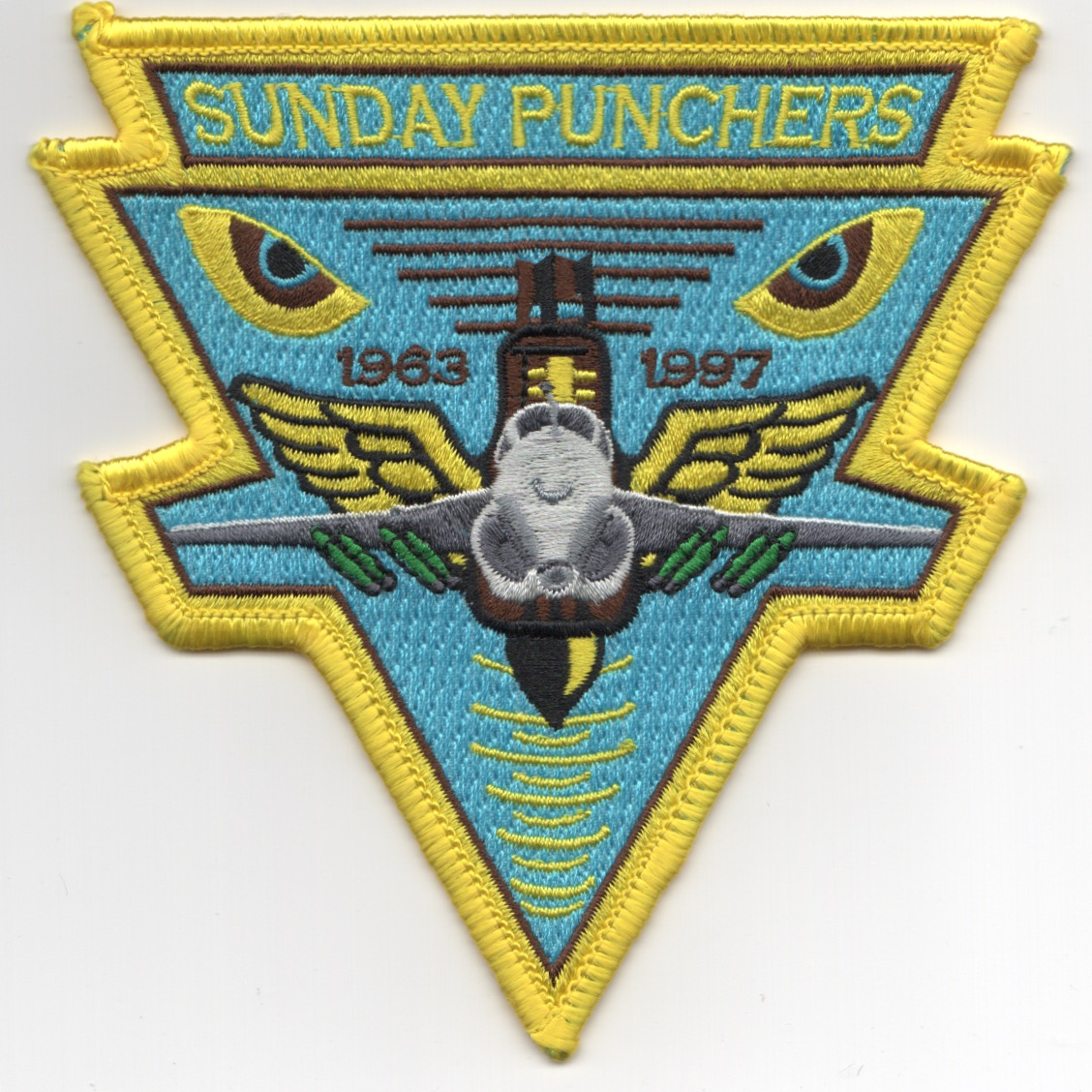 Another AV8RSTUFF creation: This is the VA-75 Sunday Puncher ‘EYES’ Triangle made in the same design as the standard INTRUDER patch, but with the squadron’s ORIGINAL colors. It has the dates 1963 – 1997, as the Sunday Punchers were the first and last Intruder Squadron….this patch does not come with velcro attached.