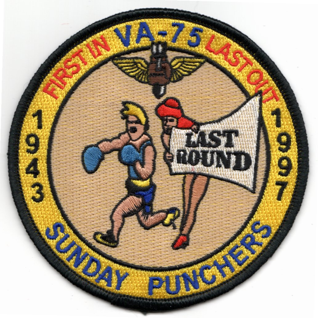 ORIGINAL: This is one of the patches created for the LAST A-6E INTRUDER cruise. It shows the ‘PUNCHERBOY’ in his stance, says “LAST ROUND” on the score card, and has the dates 1943 – 1997. These had been saved by one of the officers during those last days. They are ORIGINAL pieces, and quite rare….I was in that “last” Intruder squadron and missed out on getting one. Beautiful patch, in VERY VERY limited quantities, and does not come with velcro attached.