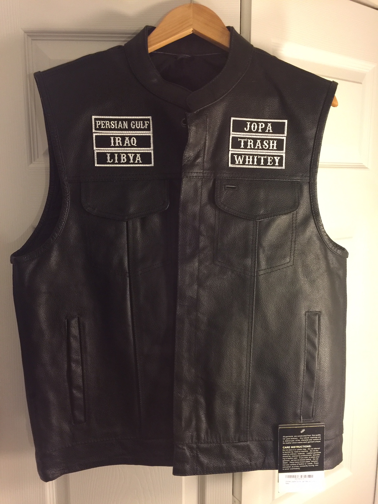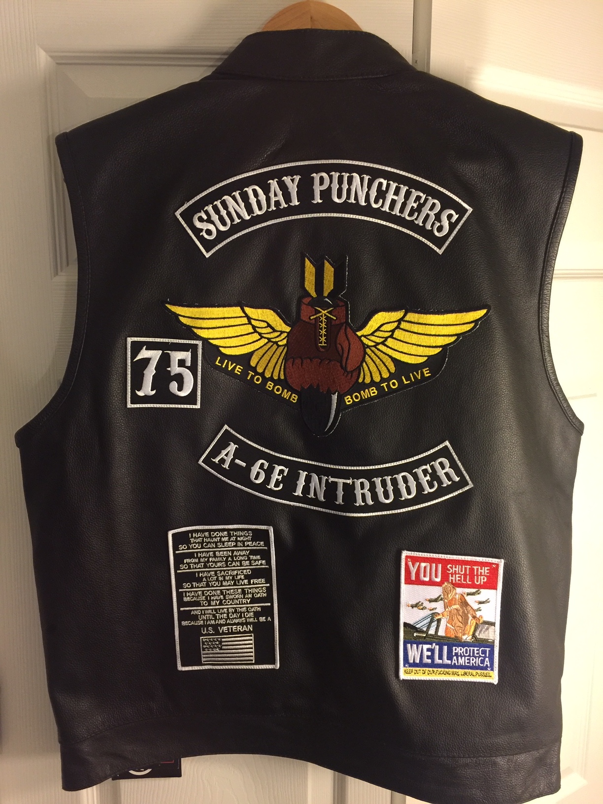 Another AV8RSTUFF creation: We created LX vests for one of the Hornet squadrons for the 2018 Tailhook convention, so this got me to thinking about (arguably) the GREATEST INTRUDER squadron ever, and making one for us! Pictured is my vest as an example. The front (shown here, back is below) has several options. Names, Callsigns, Jobs, etc, then the back patches are shown below. THESE ARE NOT STOCKED, so I can order a LX Vest (from Amazon) for you, or you can send one to me, then I will have the patches added. Now, the pricing is going to vary based on the number of patches you want on the front, the back, if I buy the vest for you or you provide, and how much the local seamstress charges me. If you want one, I’d recommend calling me and we can walk through it all to make sure we get it just right for you. I take NO RESPONSIBILITY for any local Motorcycle Clubs (MC) getting offended, but many are veterans and would probably appreciate you honoring your squadron with their colors!! Questions, call me!