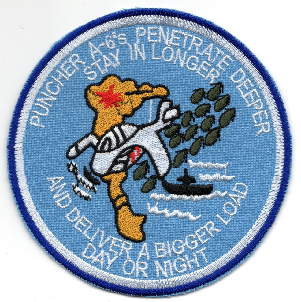 This is a reproduction of one of the Vietnam-era cruise patches for the VA-75 Sunday Punchers. It was used for multiple deployments due to the uniqueness of the aircraft and mission at that time. It says “PUNCHER A-6’s PENETRATE DEEPER, STAY IN LONGER” (top), “AND DELIVER A BIGGER LOAD DAY OR NIGHT” (bottom), and shows and angry A-6A Intruder carrying a full load of MK-82’s to a target in Vietnam. This patch does not have velcro.