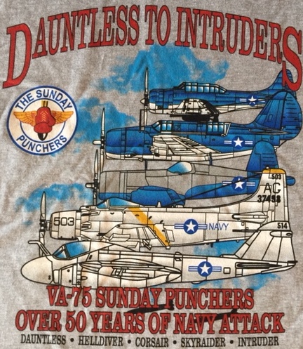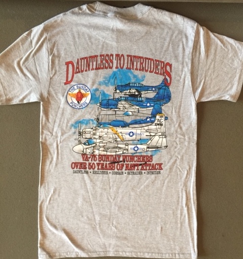 Another AV8RSTUFF creation: This is the front of the gray version of the Sunday Puncher T-shirt we had made from the original 1996 Decommissioning Party Design. We have limited numbers of the sizes listed, so please don’t be upset if these sell out before we restock. Use this link to order, then specify in the “comments” section what size you would like, or just email/call me direct. XXL runs $2 more, I’ll adjust on my end if needed.