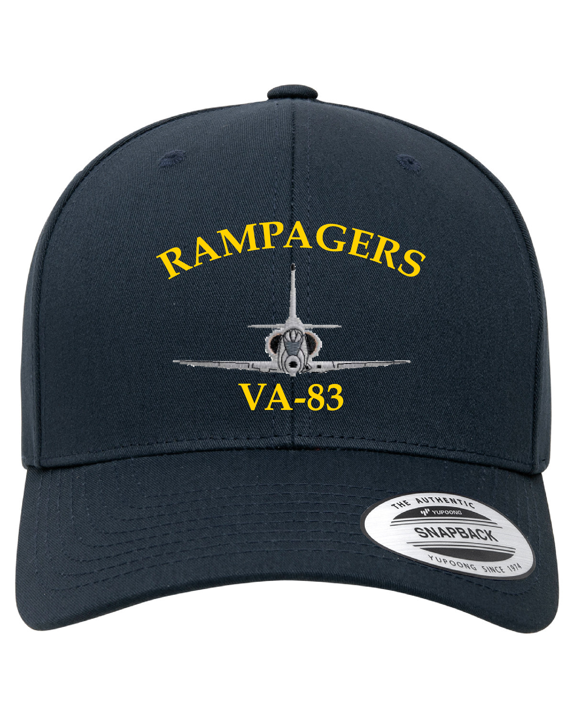 This is the dark blue version of the VA-83 *RAMPAGERS* Douglas A-4 Skyhawk squadron Ballcap that has the aircraft, squadron designator, and squadron callsign embroidered directly onto the front and has a plastic strap on the back for adjusting.