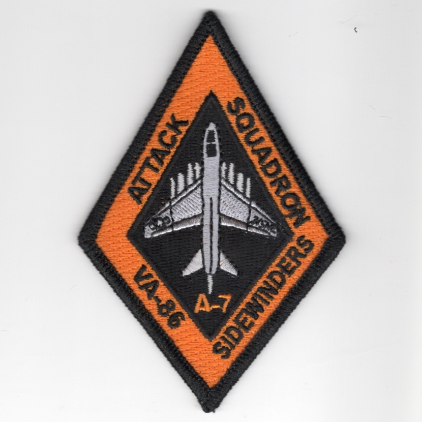 Strike Fighter Squadron EIGHT SIX (VA-86) traces its origins to Fighter Squadron 921, based at Naval Air Station St. Louis, Missouri, during the Korean War in February 1951. In February 1953, the squadron was re-designated VF-84 while deployed to Guantanamo Bay, Cuba, aboard USS ANTIETAM (CV 36). In July 1955, the squadron was re-designated VA-86 Sidewinders. From 1955 to 1987, Sidewinders flew the F4-U “Corsair,” F8F-2 “Bearcat,” F9F-5 “Panther,” F7U-3M “Cutlass,” also known as the “Ensign Eater,” A4D-1 “Skyhawk” and A-7A/C/E “Corsair.” This is the “throwback” heritage patch created for the Sidewinders to celebrate their legacy. This version shows the A-7 Planform WITH weapons and does not come with velcro attached.