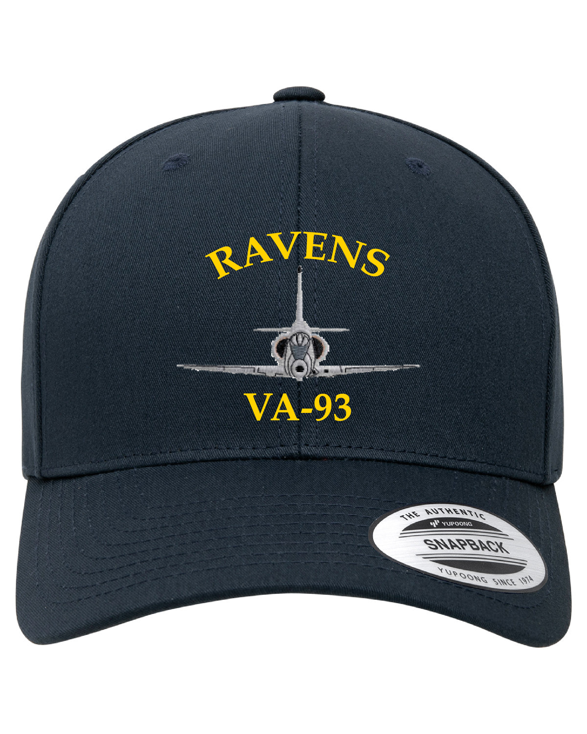 This is the dark blue version of the VA-93 *RAVENS* Douglas A-4 Skyhawk squadron Ballcap that has the aircraft, squadron designator, and squadron callsign embroidered directly onto the front and has a plastic strap on the back for adjusting.