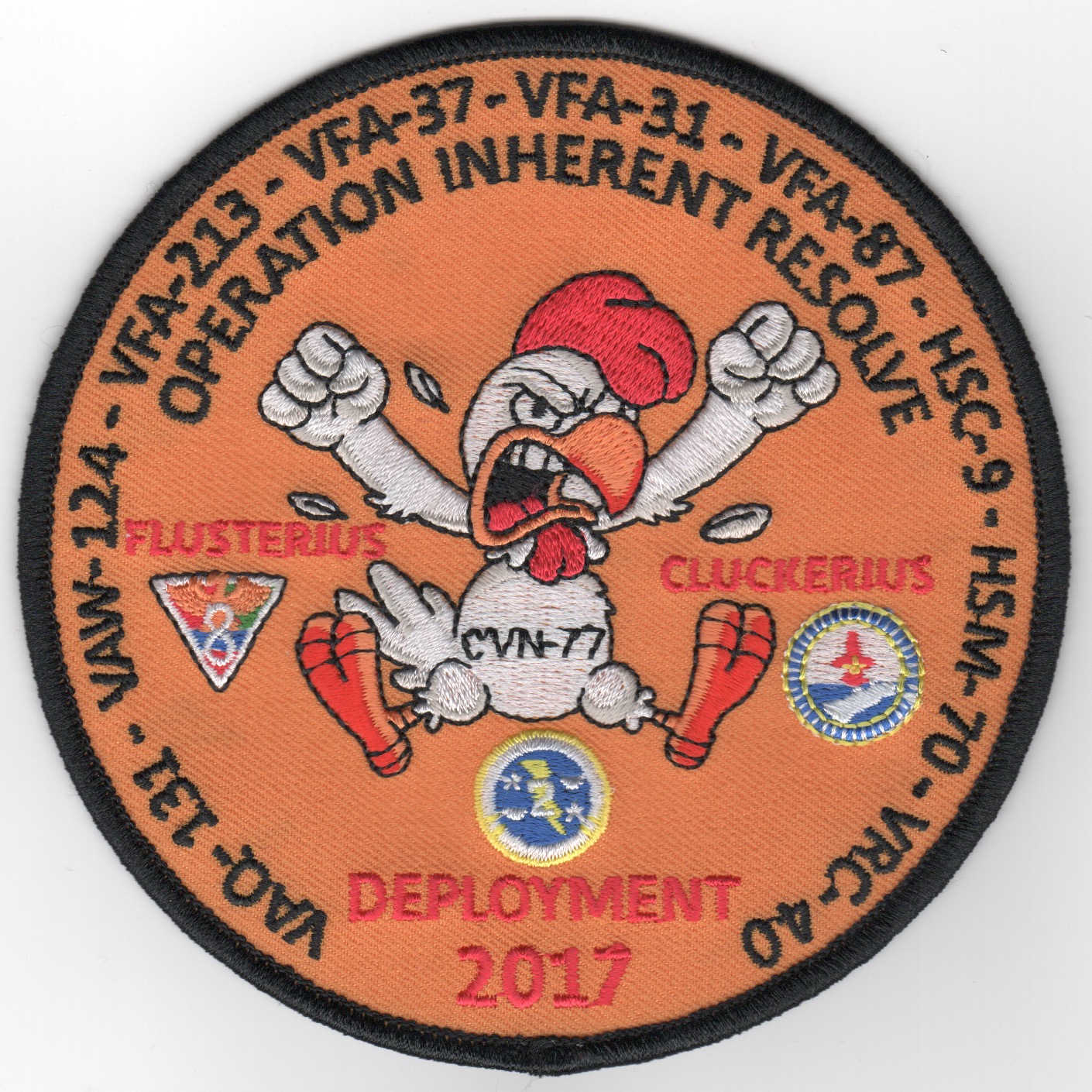 AV8RSTUFF picked up this patch FROM the squadron when we bought all their “”””old stock””””. It’s from their 2017 “”””OIR”””” deployment onboard CVN-77 as part of CVW-2. It shows a “”””flustered chicken”””” and says “”””FLUSTERIUS”””” “”””CLUCKERIUS”””” and lists all the squadrons along the border. No velcro on back.