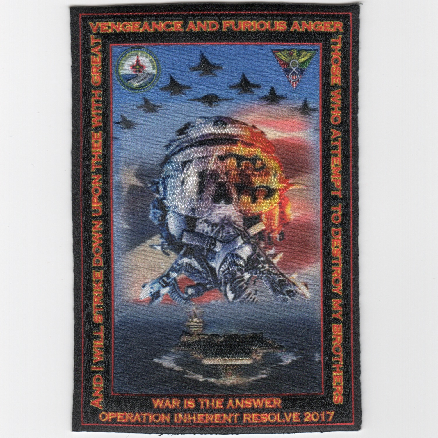 This is another AV8RSTUFF production for VAQ-131 for their 2017 ‘Operation Inherent Resolve’ cruise and may be the nicest patch I’ve ever seen!!! It says (along left/top/right) “AND I WILL STRIKE DOWN UPON THEE WITH GREAT VENGEANCE AND FURIOUS ANGER THOSE WHO ATTEMPT TO DESTROY MY BROTHERS”. It also says (bottom) “WAR IS THE ANSWER”. if you look at the image, you will see the SKULL and HELMET interposed over each other. This is the new “HYBRID” patch that only AV8RSTUFF is offering at the moment……amazing detail. No velcro on back.