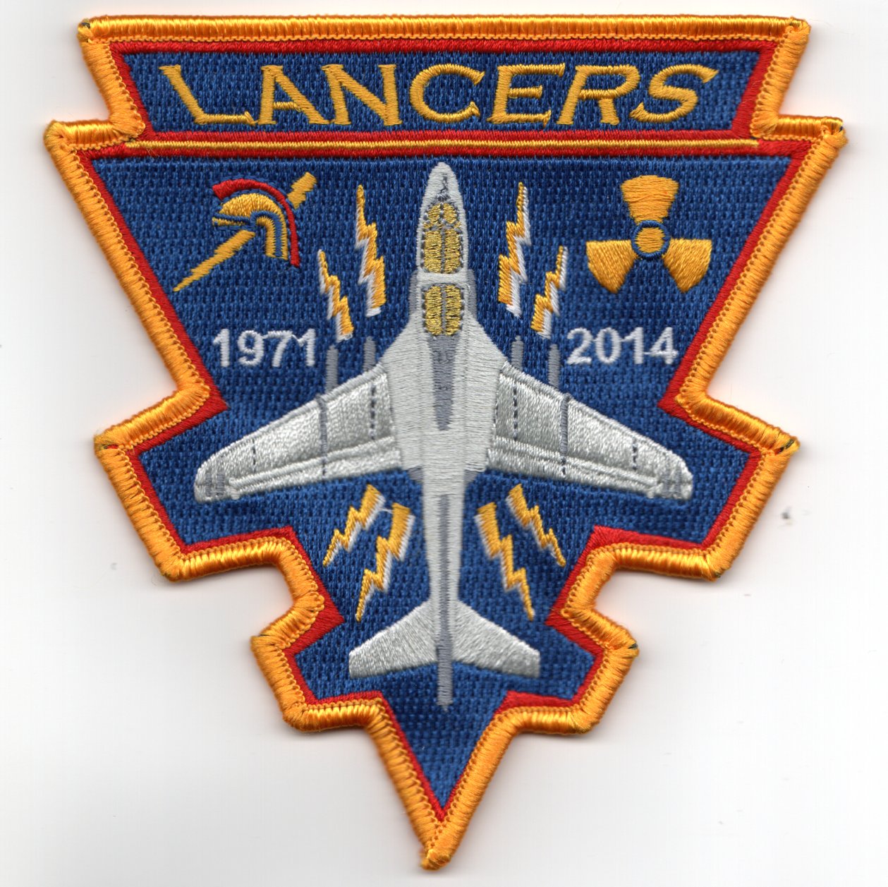 (Another AV8RSTUFF Creation) Electronic Attack Squadron 131 (VAQ-131), also known as the “Lancers,” is a US Navy tactical jet aircraft squadron specializing in kinetic and non-kinetic Suppression of Enemy Air Defenses (SEAD). They are based at NAS Whidbey Island, WA, currently flying the EA-18G Growler. Their radio callsign is “Skybolt”. This is the EA-6B (previous aircraft) 2014 DECOMMISSION patch showing the planform of the Prowler with the dates of service of that particular aircraft (1971 – 2014). This patch does not have velcro attached.