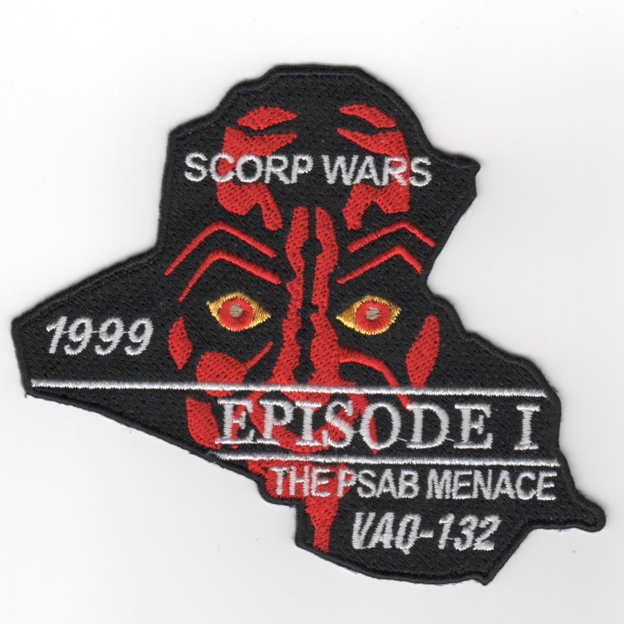 This is the 1999 “SCORP WARS” cruise patch created for VAQ-132 for their Operation SOUTHERN WATCH deployment to PSAB. It is in the shape of the country of Iraq, has Darth Maul (Star Wars, Episode I) and says “THE PSAB MENACE” along the bottom. This patch does not come with velcro attached.