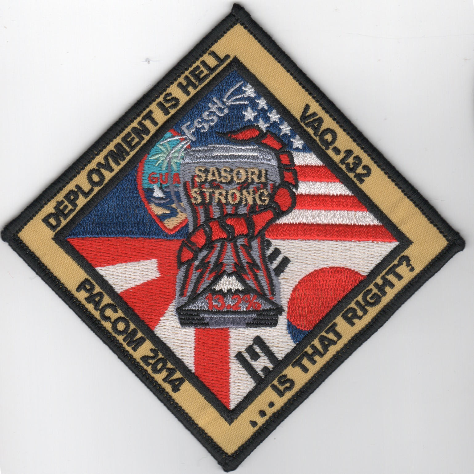 This is the large version of the 2014 PACOM (Pacific Command) cruise that says “DEPLOYMENT IS HELL…IS THAT RIGHT?”. In the middle of the patch is a beercan with the Scorpion tail around it and says “SASORI STRONG” and 13.2%. It has the US, Japanese, S. Korean and GUAM flags on it. Nice patch, but I only have a few……