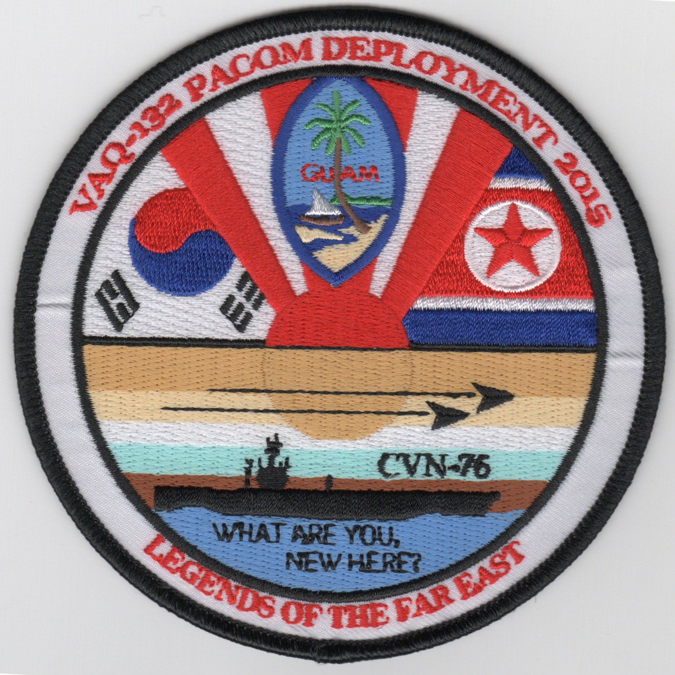 This is the 2015 PACOM (Pacific Command) cruise that says “WHAT ARE YOU, NEW HERE?” along the bottom and “LEGENDS OF THE FAR EAST” along the bottom edge. This patch DOES NOT have the subliminal message on it, see the one below for a “variation” of it. This patch does not come with velcro already attached.