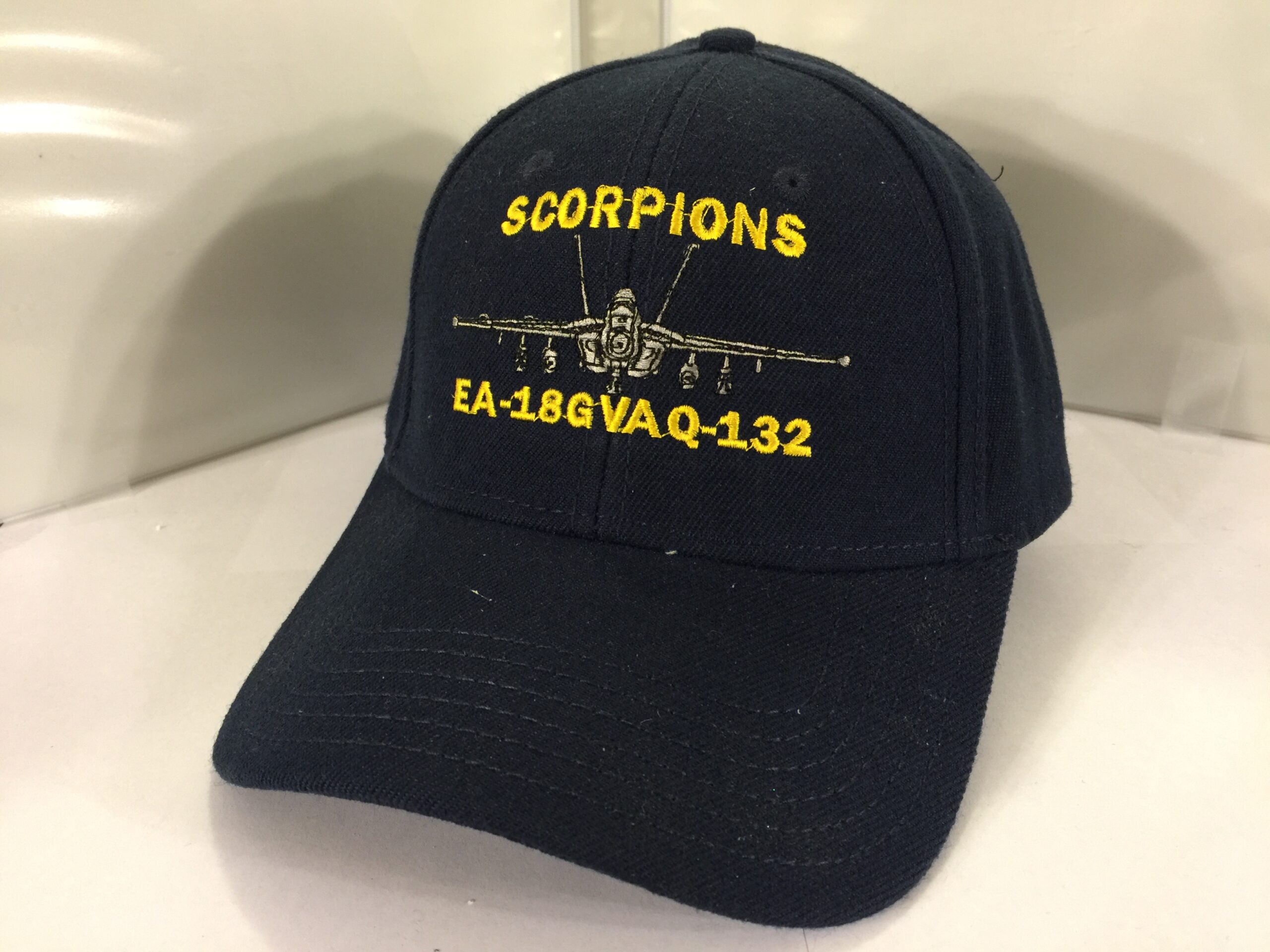 This is the dark blue ballcap with the EA-18G embroidered with the EA-18G and the Squadron Designator embroidered under the aircraft!