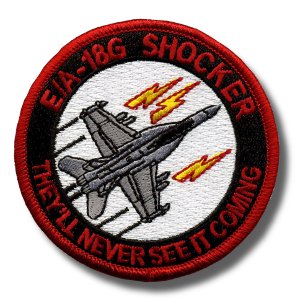 This is the black/red-bordered version of the aircraft “bullet” patch for the VAQ-132 ‘Scorpions’ that fly the EA-18 ‘GROWLER’ out of NAS Whidbey Island, WA. It says “SHOCKER” at the top and “THEY’LL NEVER SEE IT COMING” across the bottom. This patch does not have velcro attached.