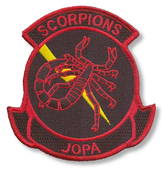 This is the black/red version of the JOPA patch for the VAQ-132 ‘Scorpions’ that fly the EA-18 ‘GROWLER’ out of NAS Whidbey Island, WA.