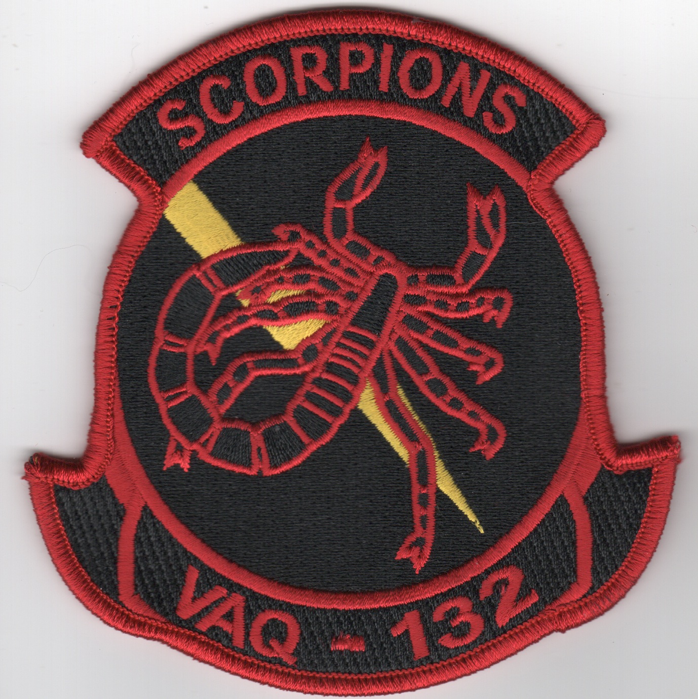 (From the Squadron Supplier): This is the red/black version of the ‘RED AIR’ squadron patch for the VAQ-132 ‘Scorpions’ that fly the E/A-18G “GROWLER” out of NAS Whidbey Island, WA. They wear this patch when conducting the ‘aggressor’ role. This patch does not have velcro attached.