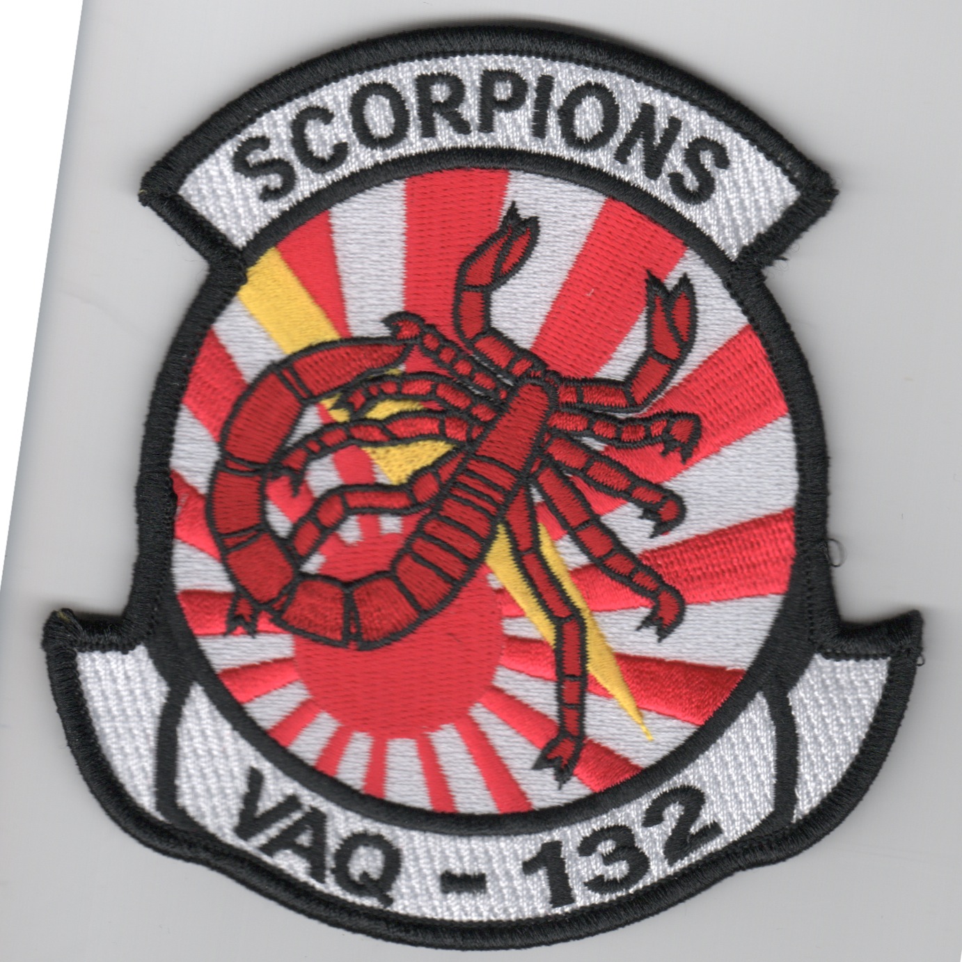 This is the ‘setting sun’ version of the current squadron patch for the VAQ-132 ‘Scorpions’ that fly the E/A-18G “GROWLER” out of NAS Whidbey Island, WA.