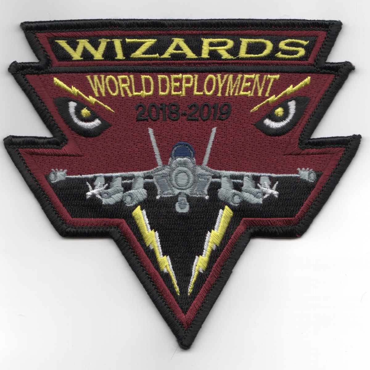 (Another AV8RSTUFF Creation): Electronic Attack Squadron 133 (VAQ-133) is an EA-18G Growler squadron of the United States Navy based at NAS Whidbey Island, WA. Beginning in 2013, the squadron began the transition from the EA-6B ‘PROWLER’ to the EA-18G ‘GROWLER’. Upon completion of the transition in spring of 2014, they returned to their attachment to Carrier Air Wing Nine (CVW-9). The squadron’s nickname is “Wizards” and its radio callsign is “Magic”. This is the “EYES” version of the VAQ-133 2018-2019 ‘WORLD DEPLOYMENT’ cruise patch. It says “WIZARDS” at the top and shows their ‘Growler’ aircraft coming straight at you! They were decommissioned in June 1992, then recommissioned in 1996.
