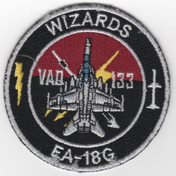 This is the White-Lasercut-Border version of the aircraft “bullet” patch for the VAQ-133 ‘WIZARDS’ that fly the EA-18 ‘GROWLER’ out of NAS Whidbey Island, WA. This was found in a small Korean embroidery shop and has the “theater-made” feel to it. It does not have velcro attached.