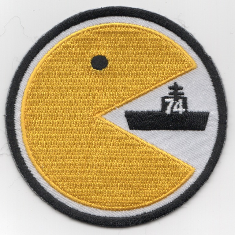 This is just in direct from the “”””WIZARDS”””” Coffee Mess. This is the 2018 ‘yellow’ version of the ‘PACMAN’ cruise patch created for VAQ-132 and CVN-74. It shows the standard ‘PACMAN’ character getting ready to devour the CVN-74 (USS Stennis) aircraft carrier (not sure the message behind this one). This patch does not come with velcro attached.