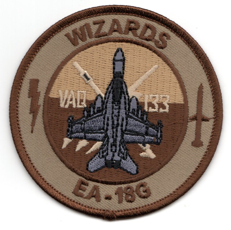 This is the desert-version of the aircraft “bullet” patch for the VAQ-133 ‘WIZARDS’ that fly the EA-18 ‘GROWLER’ out of NAS Whidbey Island, WA. It does not have velcro attached.