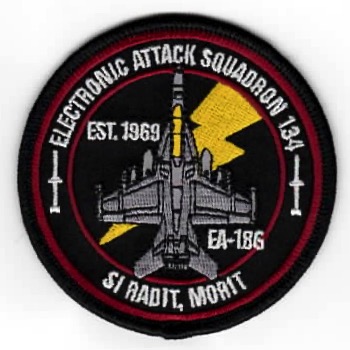 This is the black version of the VAQ-134 E/A-18G bullet patch that shows the planform of the aircraft and says “SI RADIT, MORIT” (no idea what that means….) This patch does not come with velcro already attached.