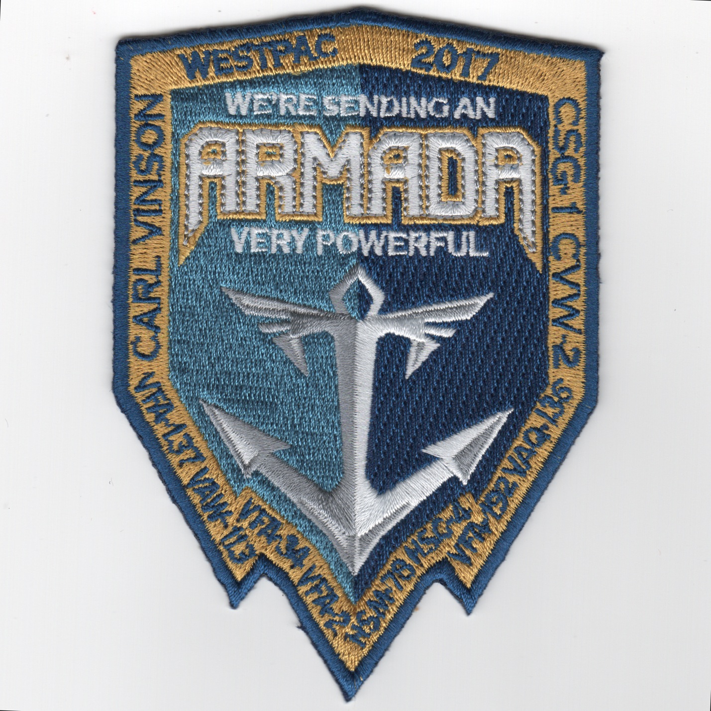 Another AV8RSTUFF creation for VAQ-136 for their 2017 WestPac Cruise onboard the USS Carl Vinson. It says “WE’RE SENDING AN ARMADA VERY POWERFUL” and lists all the squadrons along the borders. Very cool patch, as they were the Armada sitting off the coast of North Korea early in 2017. No velcro on this.