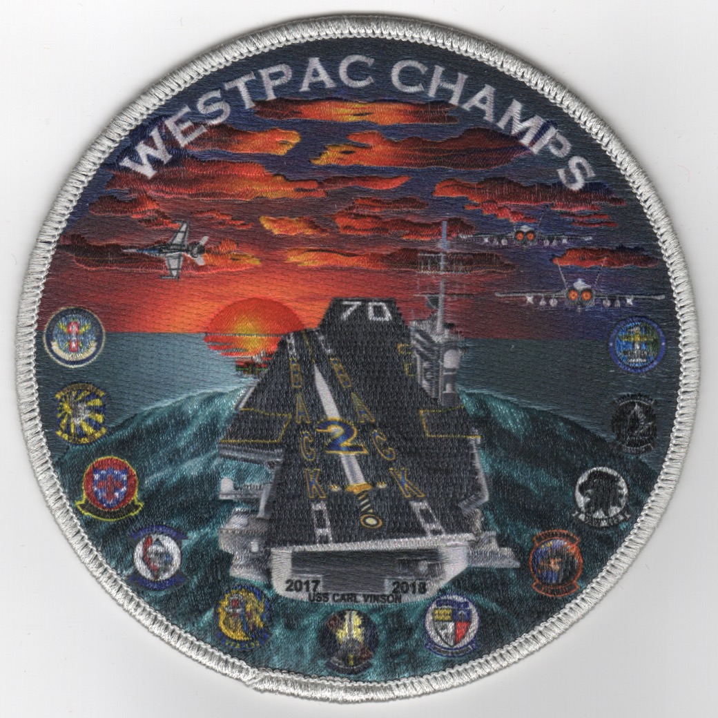 Another AV8RSTUFF creation for VAQ-136 for their 2018 WestPac Cruise onboard the USS Carl Vinson. I know I keep saying week after week that this is my favorite patch, but this one is UNBELIEVABLY beautiful!! Using the new sublimation process that only we do, this shows the carrier headed back out to see with the sun setting in the West. It says BACK 2 BACK on the flight deck and has the squadron logos around the edge…..GORGEOUS, and I was only allowed a few of them!! No velcro on this.