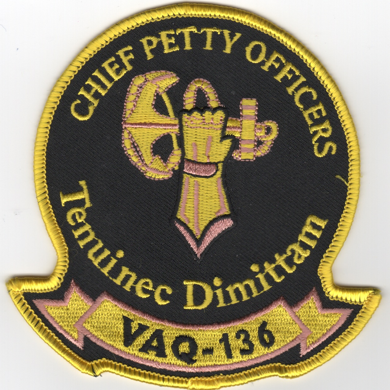 The ‘Gauntlets’ of VAQ-136 are based at NAF Atsugi, Japan and flew the Grumman EA-6B Prowler. They were established in April 1973, then transitioned from the USS Midway (CV-41) to the USS Independence (CV-62) in August 1991 when the latter became home-ported with CVW-5 at Yokosuka. This is their “Chief Petty Office (CPO)” patch and says “TENUINEC DIMITTAM” at the bottom.