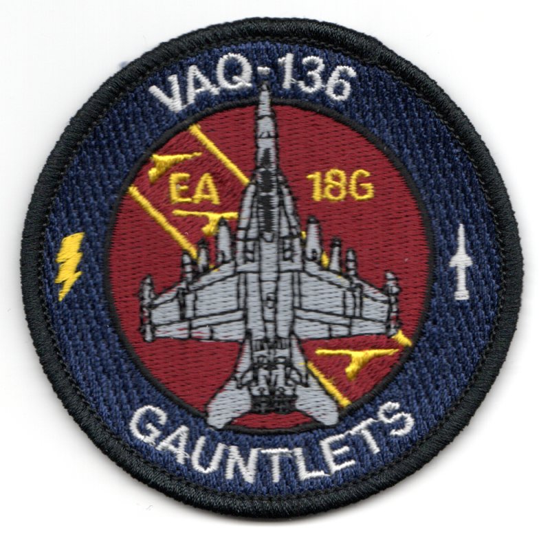 (From the Squadron supplier): This is the “dark blue” version of the current EA/-1G ‘bullet’ patch for VAQ-136 and says “GAUNTLETS” along the bottom. The ‘Gauntlets’ of VAQ-136 are based at NAF Atsugi, Japan and flew the Grumman EA-6B Prowler. They were established in April 1973, then transitioned from the USS Midway (CV-41) to the USS Independence (CV-62) in August 1991 when the latter became home-ported with CVW-5 at Yokosuka. They currently fly the E/A-18G “Growler”. This patch does not have velcro attached.