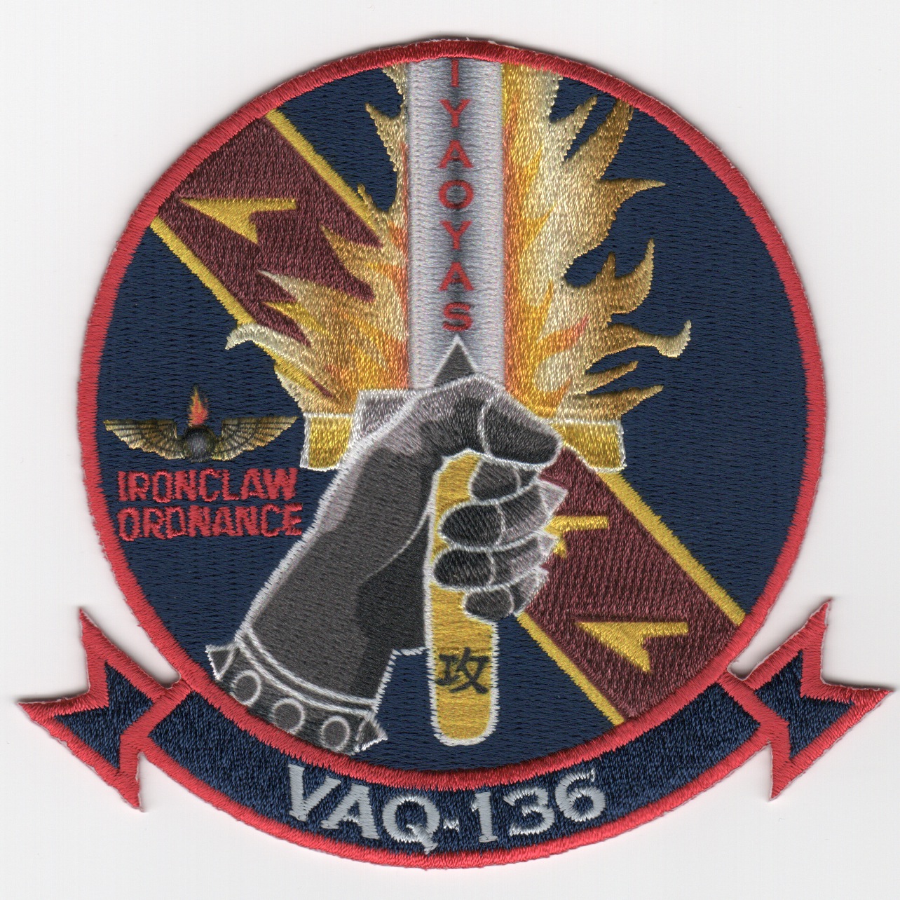 Yet another creation by AV8RSTUFF for the ‘Gauntlets’ of VAQ-136 who are based at NAF Atsugi, Japan and flew the Grumman EA-6B Prowler, but have since transitioned to the EA-18 Growler. They were established in April 1973, then transitioned from the USS Midway (CV-41) to the USS Independence (CV-62) in August 1991 when the latter became home-ported with CVW-5 at Yokosuka. This is their “Ordnance/IYAOYAS” patch created in the “sublimation” style, which is only offered by us. If you don’t know what “IYAOYAS” means, then you probably don’t need this collectible, but if you email me, I’ll let ya know. Only have a few of these, and they do not have velcro.