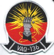 This is the white border version of the current squadron patch for VAQ-136. The ‘Gauntlets’ of VAQ-136 are based at NAF Atsugi, Japan and flew the Grumman EA-6B Prowler, but currently operate the EA-18G “GROWLER”. They were established in April 1973, then transitioned from the USS Midway (CV-41) to the USS Independence (CV-62) in August 1991 when the latter became home-ported with CVW-5 at Yokosuka.