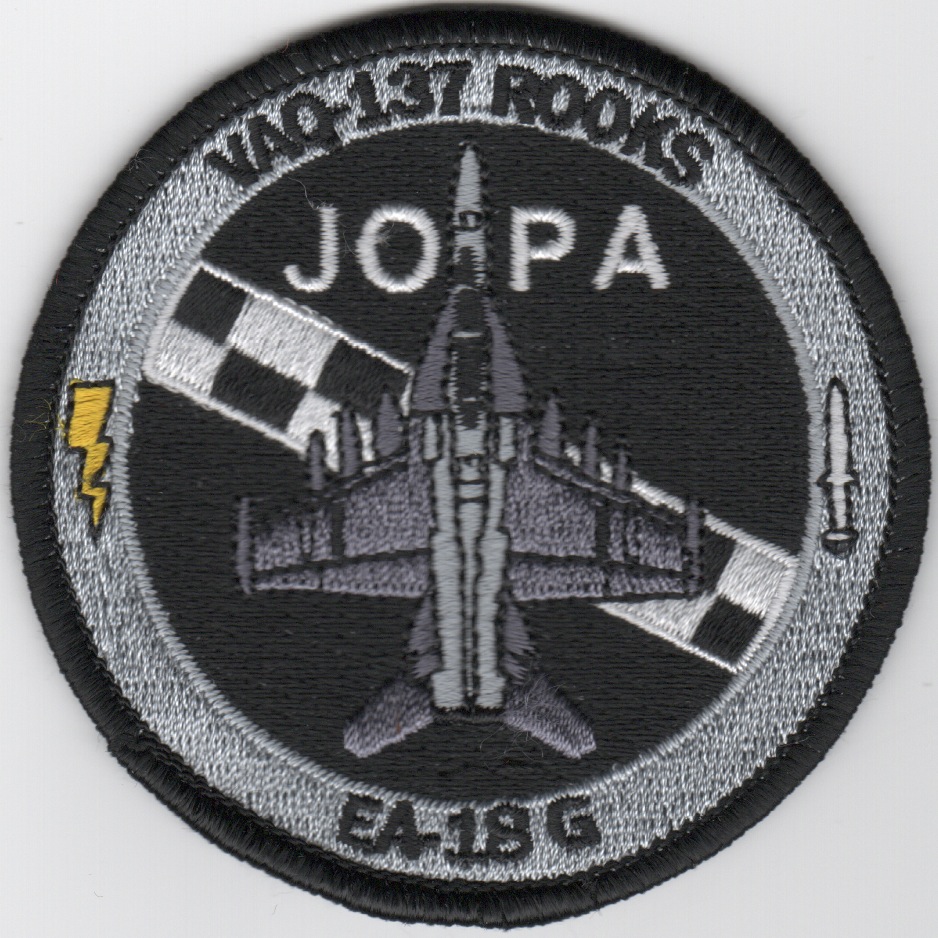The ‘Rooks’ of VAQ-137 are based out of NAS Whidbey Island, WA and fly the Navy’s jamming platform, the new McDonnel Douglas EA-18G Growler. This is the black-bordered bullet version of their ‘Junior Officer Protection Agency (JOPA)’ patch they created and DOES come with velcro attached.
