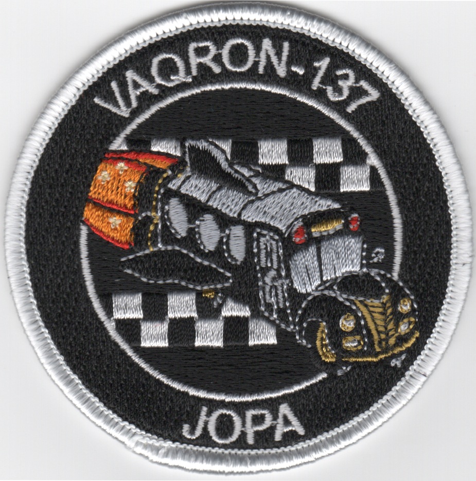 The ‘Rooks’ of VAQ-137 are based out of NAS Whidbey Island, WA and fly the Navy’s jamming platform, the new McDonnel Douglas EA-18G Growler. This is the white-bordered bullet version of their ‘Junior Officer Protection Agency (JOPA)’ patch they created and does not come with velcro attached.