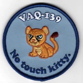 (Another AV8RSTUFF Creation): Electronic Attack Squadron 139 (VAQ-139), also known as the “Cougars”, is an EA-18G Growler squadron of the United States Navy. They specialize in electronic attack and are currently stationed at Naval Air Station Whidbey Island, WA. This is the “NO TOUCH KITTY” patch which is the “baby cougar”, so the “kitty” is off-limits to anyone outside the squadron. This patch does not have velcro attached.