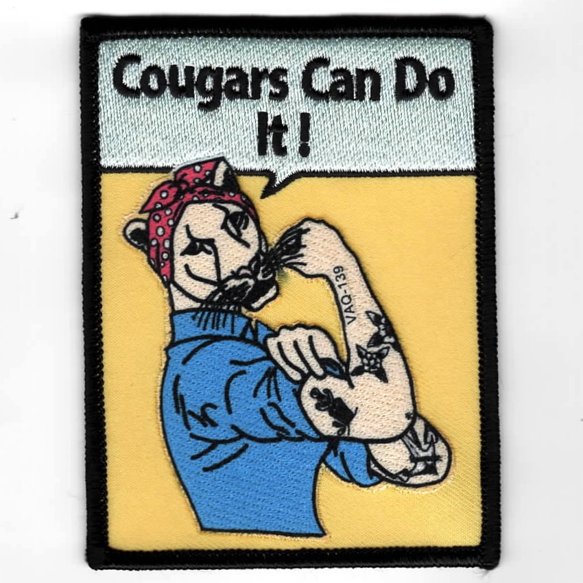 (Another AV8RSTUFF Creation): Electronic Attack Squadron 139 (VAQ-139), also known as the “Cougars”, is an EA-18G Growler squadron of the United States Navy. They specialize in electronic attack and are currently stationed at Naval Air Station Whidbey Island, WA. This is the “ROSIE RIVETER” patch created as one of the 2023 WESTPAC carrier deployment patches showing the COUGAR mascot in the ‘Rosie Riveter’ attire. This patch does not have velcro attached.