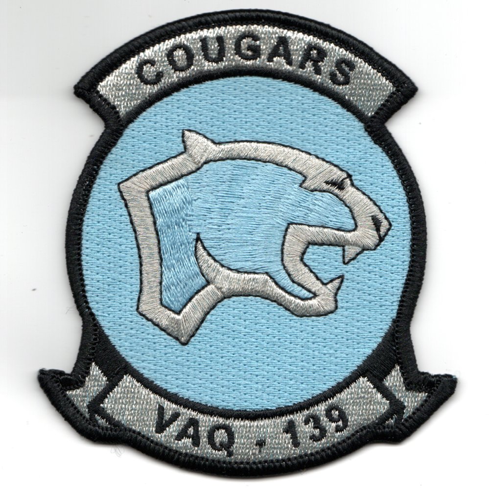 Electronic Attack Squadron 139 (VAQ-139), also known as the “Cougars”, is an EA-18G Growler squadron of the United States Navy. They specialize in electronic attack and are currently stationed at Naval Air Station Whidbey Island, WA. This is the 2-tab, blue/silver version of their current squadron patch and was used in the 1986 movie ‘TOP GUN’ by ‘COUGAR’. This patch does not have velcro attached.