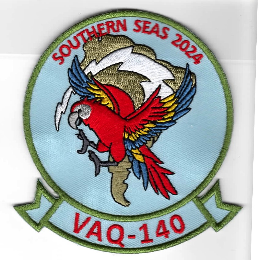 (Another AV8RSTUFF creation): Electronic Attack Squadron 140 (VAQ-140) is a US Navy electronic attack squadron. Known as the “Patriots”, the squadron operates the EA-18G Growler from NAS Whidbey Island, WA. They deploy aboard USSÊHarry S. Truman using the callsign “Talon”. This is the light blue twill version of their *2024 SOUTHERN SEAS* Cruise patch. This patch does NOT come with velcro attached.