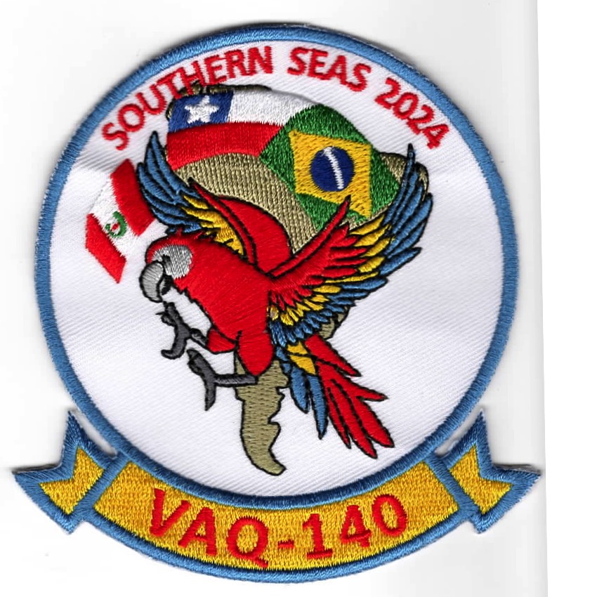 (Another AV8RSTUFF creation): Electronic Attack Squadron 140 (VAQ-140) is a US Navy electronic attack squadron. Known as the “Patriots”, the squadron operates the EA-18G Growler from NAS Whidbey Island, WA. They deploy aboard USSÊHarry S. Truman using the callsign “Talon”. This is the white twill version of their *2024 SOUTHERN SEAS* Cruise patch. This patch does NOT come with velcro attached.