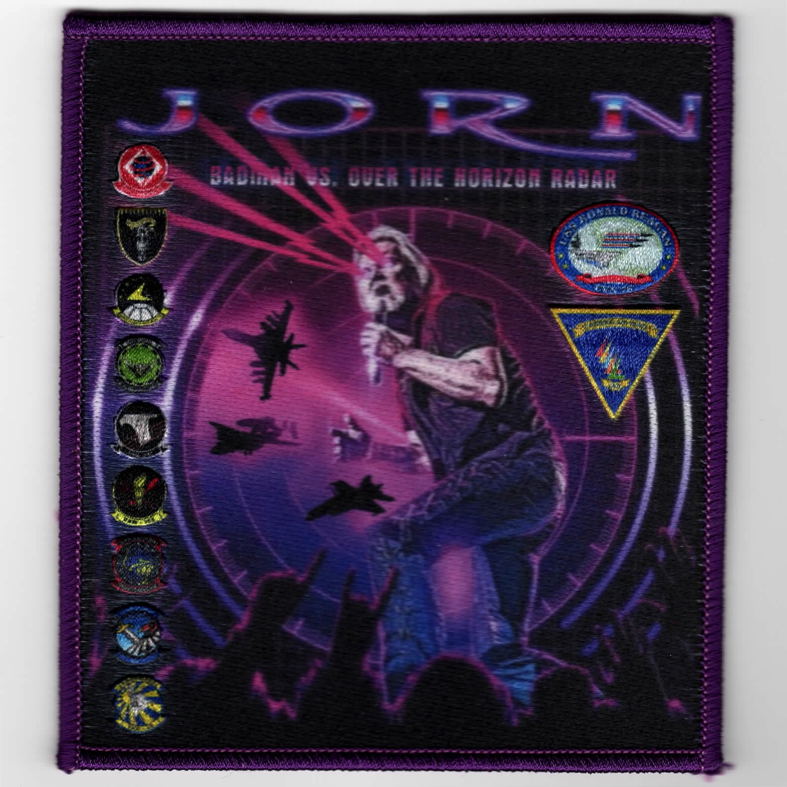 (Another AV8RSTUFF Creation): This is the sublimated version of the VAQ-141 2023 *JORN* cruise patch. It says “JORN” (top), lists all the squadron logos along the left border, shows the carrier (CVN-76) and Air Wing (CVW-5) logos along the right border, and says “BADMAN VS. OVER T HE HORIZON RADAR” (top). There is no velcro on the back.