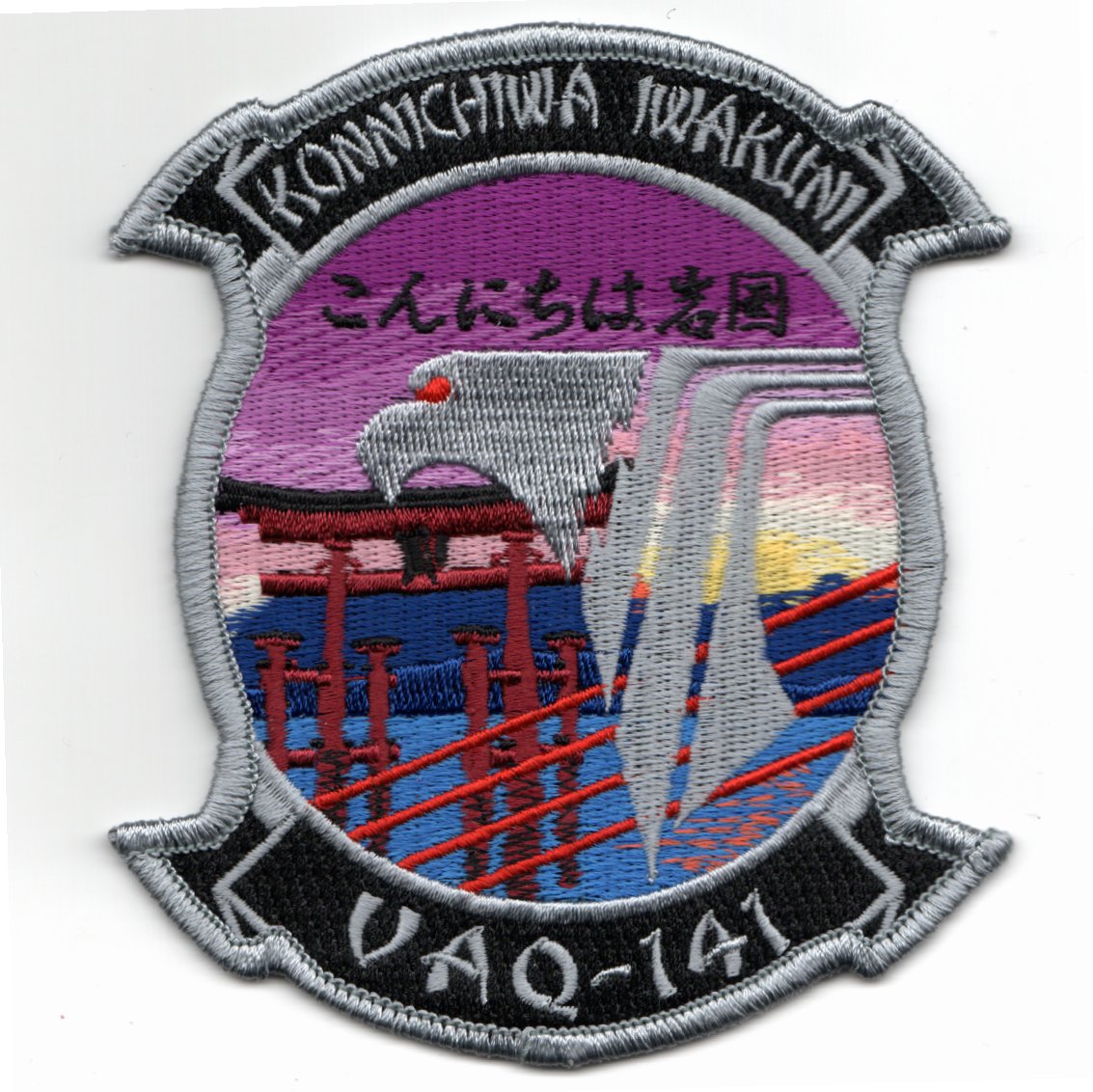 (Obtained from THEIR supplier): The “Shadowhawks” of VAQ-141 fly the McDonnell Douglas EA-18G out of NAS Whidbey Island, WA. They operated SEAD missions during the Gulf War in the EA-6B Prowler, but have since transitioned to the E/A-18G ‘Growler’ and operate in the Pacific Theater (mostly). This is the very colorful version of their squadron patch that says “KONNICHIWA IWAKUNI” along the top and does not come with velcro attached.