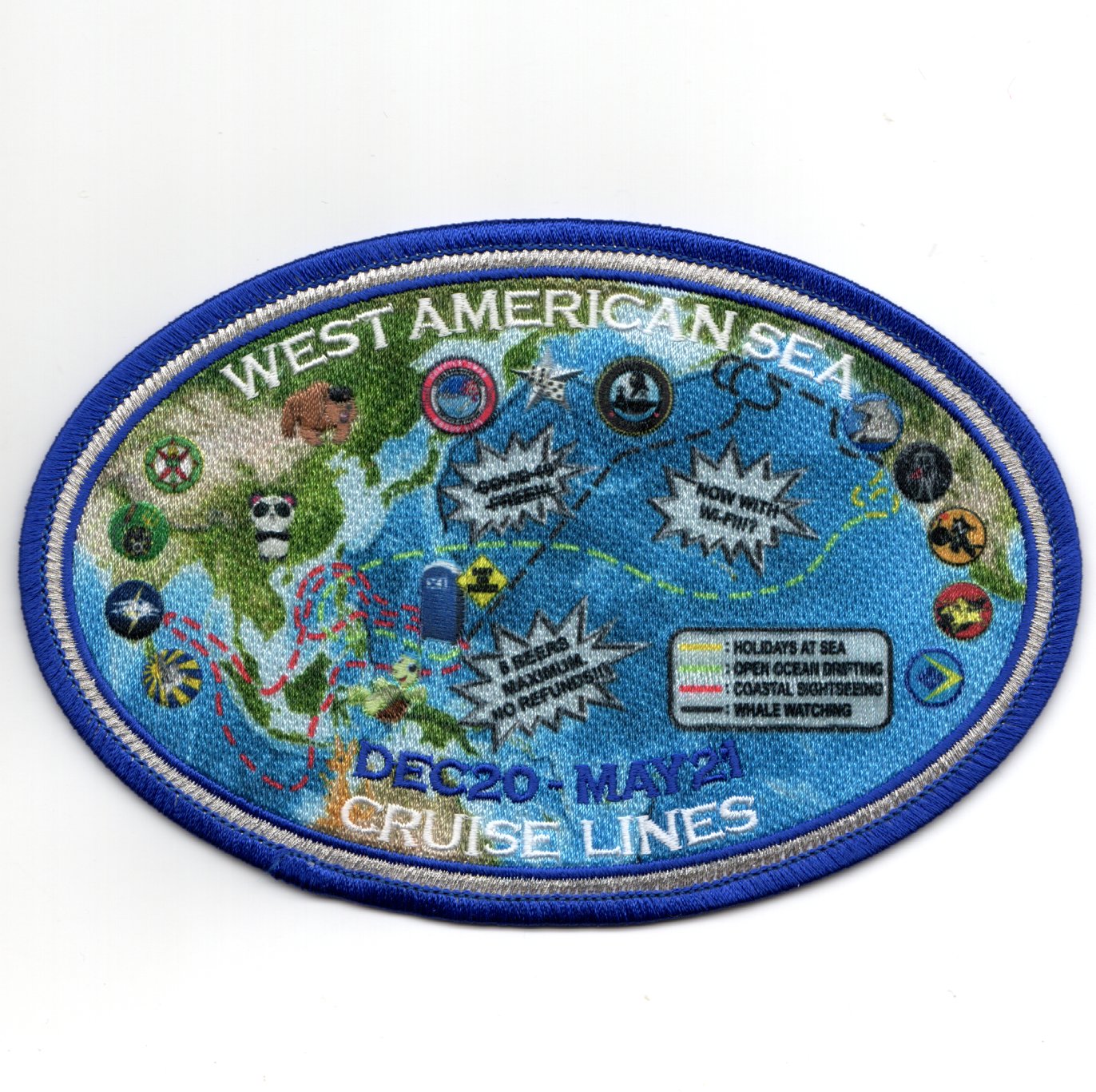 (Another AV8RSTUFF creation): Electronic Attack Squadron 142 (VAQ-142) is a US Navy electronic attack squadron. Known as the “Patriots”, the squadron operates the EA-18G Growler from NAS Whidbey Island, WA using the callsign “Talon”. This is one of their 2021 WestPac cruise patches that says “WEST AMERICAN SEA CRUISE LINES” and shows all the squadron logos SUBLIMATED (incredible detail) and the path of their sailings….. This patch does not come with velcro attached.