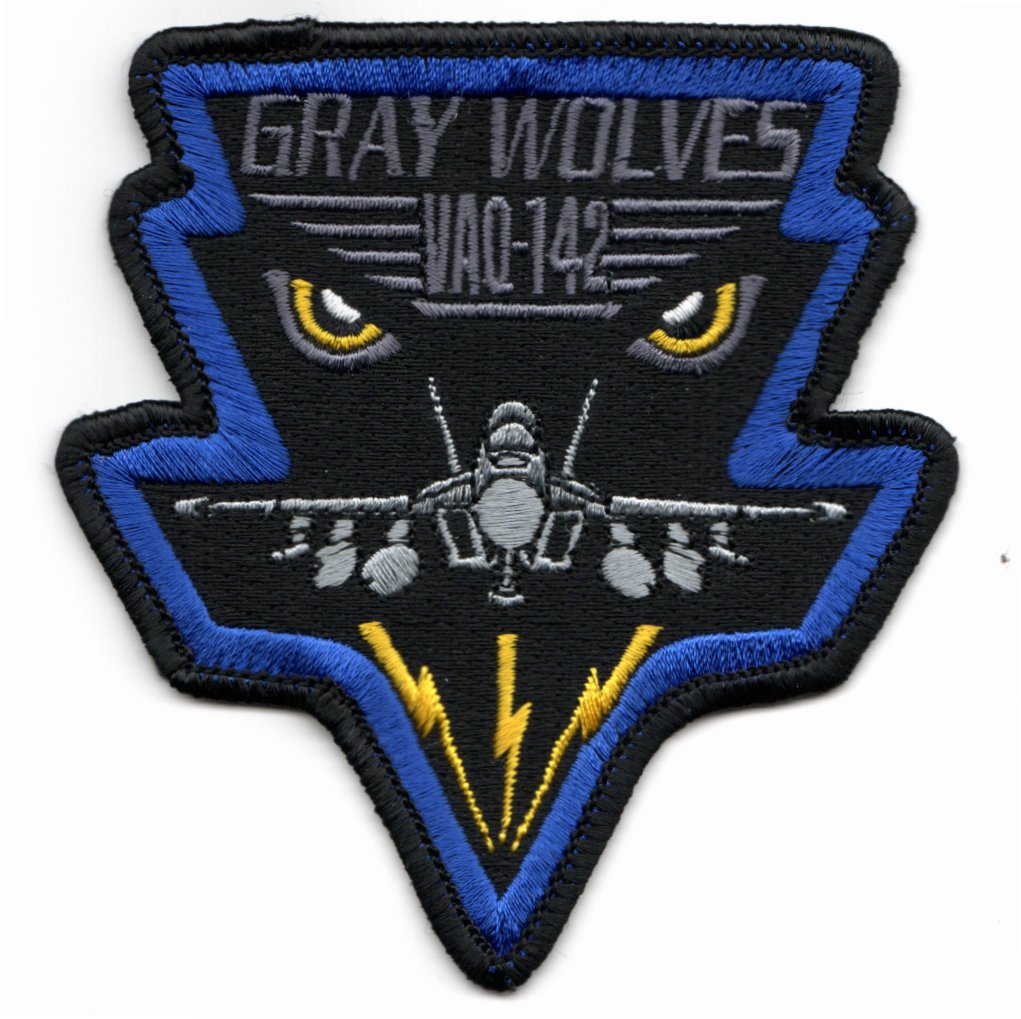 This is the blue version of the ‘E/A-18G EYES’ triangle patch created for the VAQ-142 ‘GRAY WOLVES’ showing the frontal view of the Growler with the ever-watchful ‘EYES’ in the corners and electronic ’emissions’ emanating from the aircraft! This patch does not come with velcro attached.