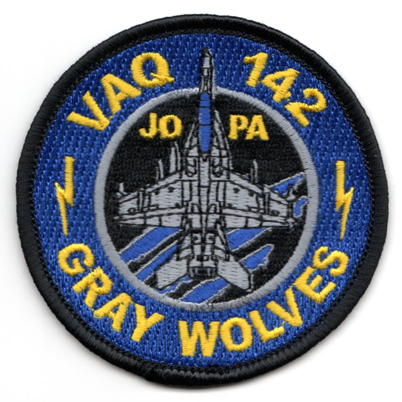 Electronic Attack Squadron 142 (VAQ-142), also known as “The Gray Wolves”, is an EA-18G Growler squadron of the US Navy. They specialize in electronic attack and are currently stationed at NAS Whidbey Island, Oak Harbor, WA. They are attached to Carrier Air Wing Eleven (CVW-11), aboard USS Nimitz (CVN-68). Their tailcode is NH and their ATC callsign is “GRIMM”. This is the blue version of their JOPA (Jr. Officer Protection Agency) patch and does not come with velcro attached.
