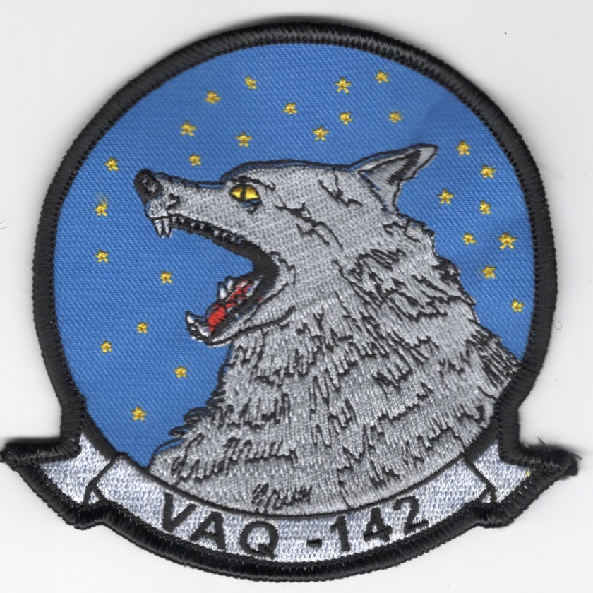 Electronic Attack Squadron 142 (VAQ-142), also known as “The Gray Wolves”, is an EA-18G Growler squadron of the US Navy. They specialize in electronic attack and are currently stationed at NAS Whidbey Island, Oak Harbor, WA. They are attached to Carrier Air Wing Eleven (CVW-11), aboard USS Nimitz (CVN-68) with a tailcode of NH and their ATC callsign is “GRIMM”. This is the squadron patch that has the wolfhead with a STARRY background and does not come with velcro attached.