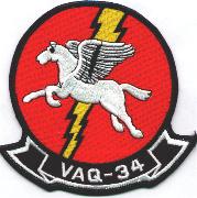The VAQ-34 “Flashbacks” fly out of NAS LeMoore, CA in the F/A-18 Hornet. They were established in March 1983 as the “Electric Horsemen”. They have since moved to NAS Point Mugu, CA and now fly the Hornet after spending many years flying the EA-7L Corsair. They train as aggressors against radar operators, and originally offered the only “high-performance” billets to women because their mission was not considered “combat”. They are joined by VAQ-33 and VAQ-35 as part of FEWSG. This is the “old” style version of their squadron patch.