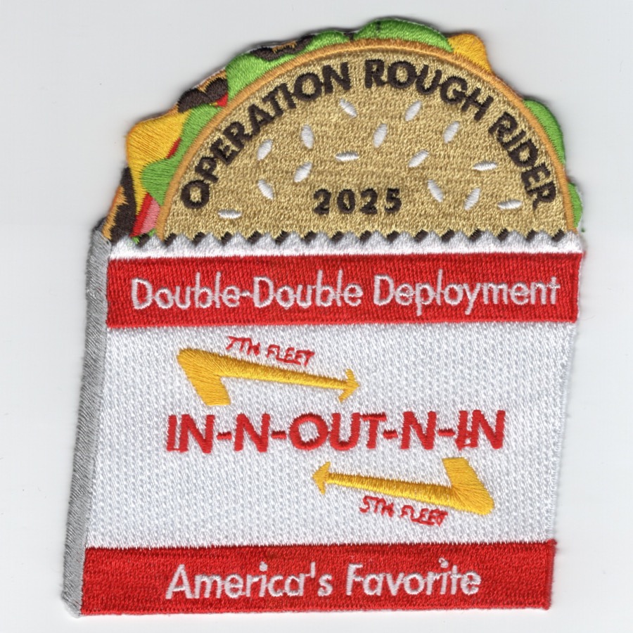 (Another AV8RSTUFF Creation): Carrier Airborne Early Warning Squadron 113 (VAW-113), known as “Black Eagles”, was established on 20 April 1967 flying the E-2A Hawkeye. Check WIKIPEDIA for a very long and distinguished flying career for the squadron! This is one of their 2025 cruise patches that goes with their other “IN-n-OUT” patch and DOES NOT come with velcro attached.